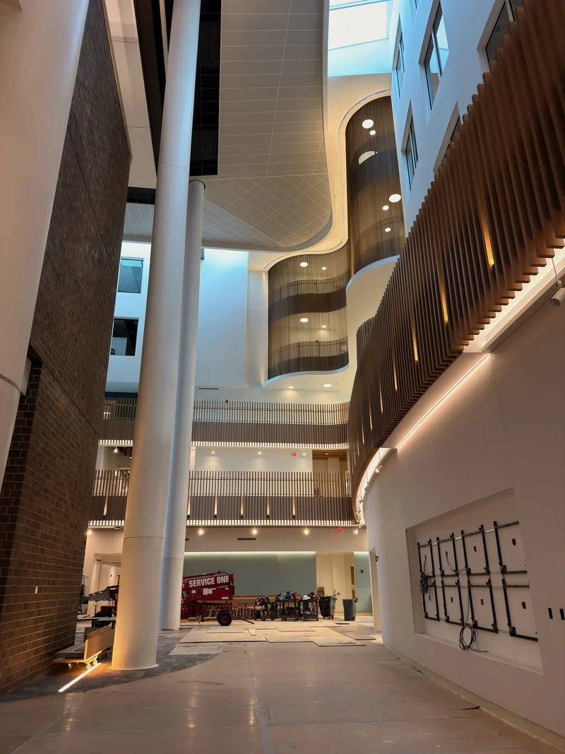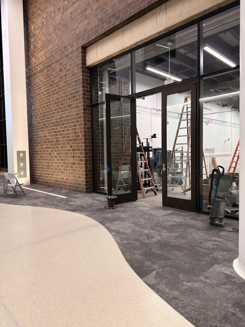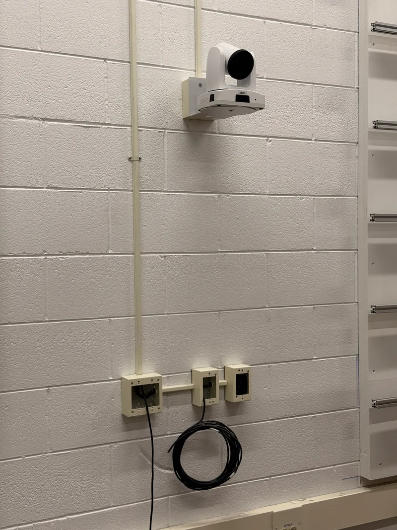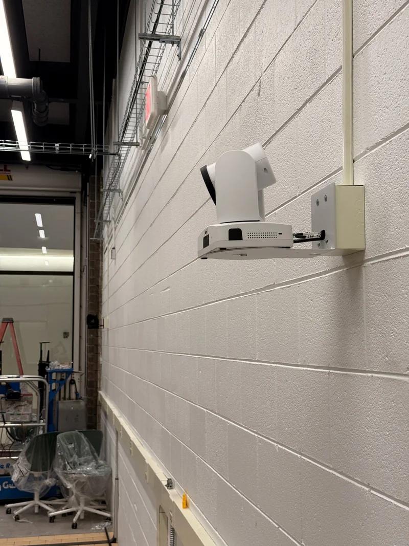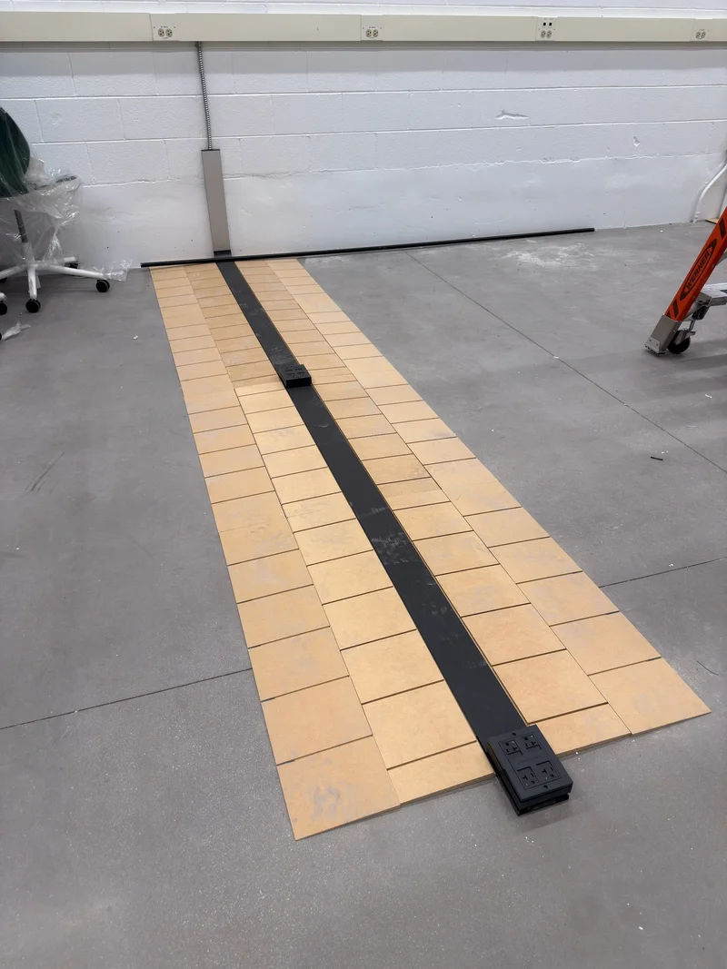 - The ‘Connectrac’ floor-based power system is installed, providing power to the center of the room.
