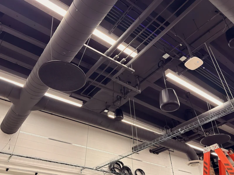 - The sound system is installed, including four speakers, two microphones, and a subwoofer.